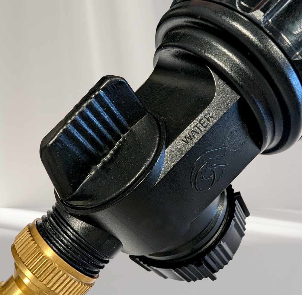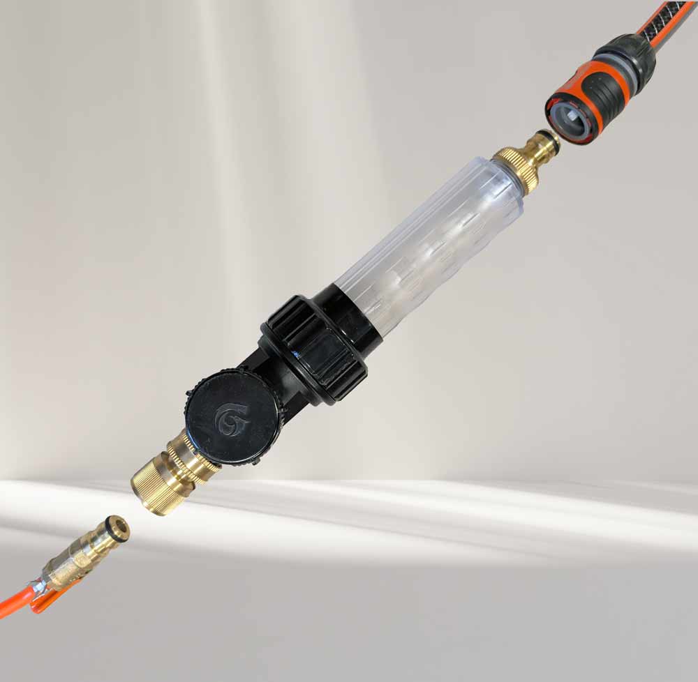 Connect your garden hose (Gardena coupling) to the inlet of the dispenser.